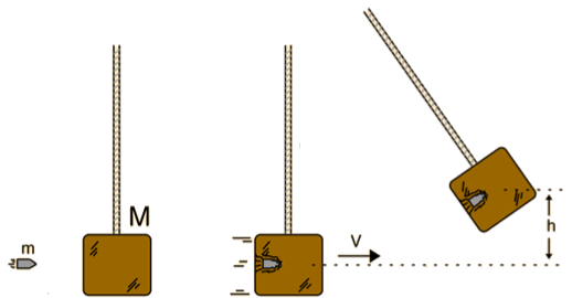 Una bala de masa $m$ viaja a la velocidad $v_b$ e impacta en un bloque de madera de masa $M$ adhiriéndose a él.