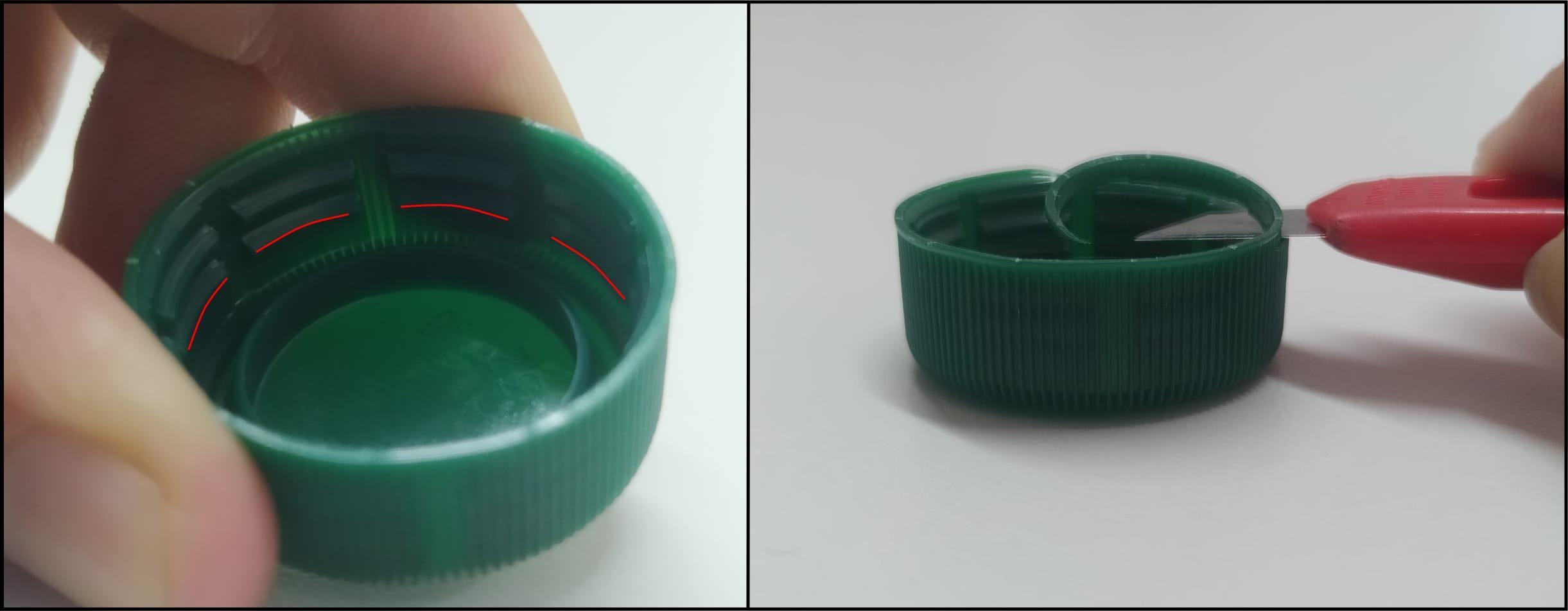 La rosca completa de la tapa impediría un cambio brusco de presión. Para resolver este inconveniente, recortaremos la rosca dejando solo una hilera de topes (marcados en rojo en la figura). El método más seguro es cortarla en espiral con la cuchilla, de una forma similar a aquella mediante la cual se le extrae la cáscara a una fruta.