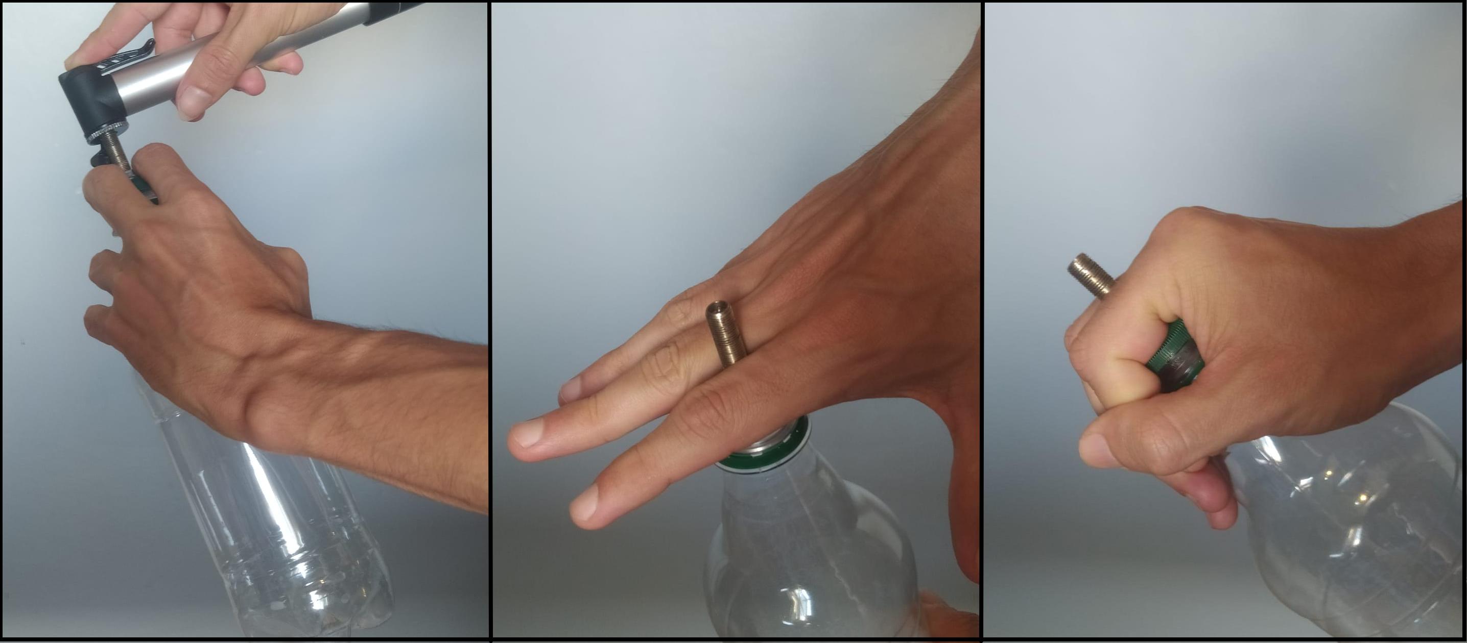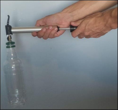 El próximo paso es sellar la botella con nuestra «tapita valvular» y comenzar a inflar. En la imagen se ve como usamos un inflador de mano, pero eso depende de lo que tengamos disponible. Podés aumentar la presión hasta que la botella se sienta tan firme como una gaseosa sin abrir.