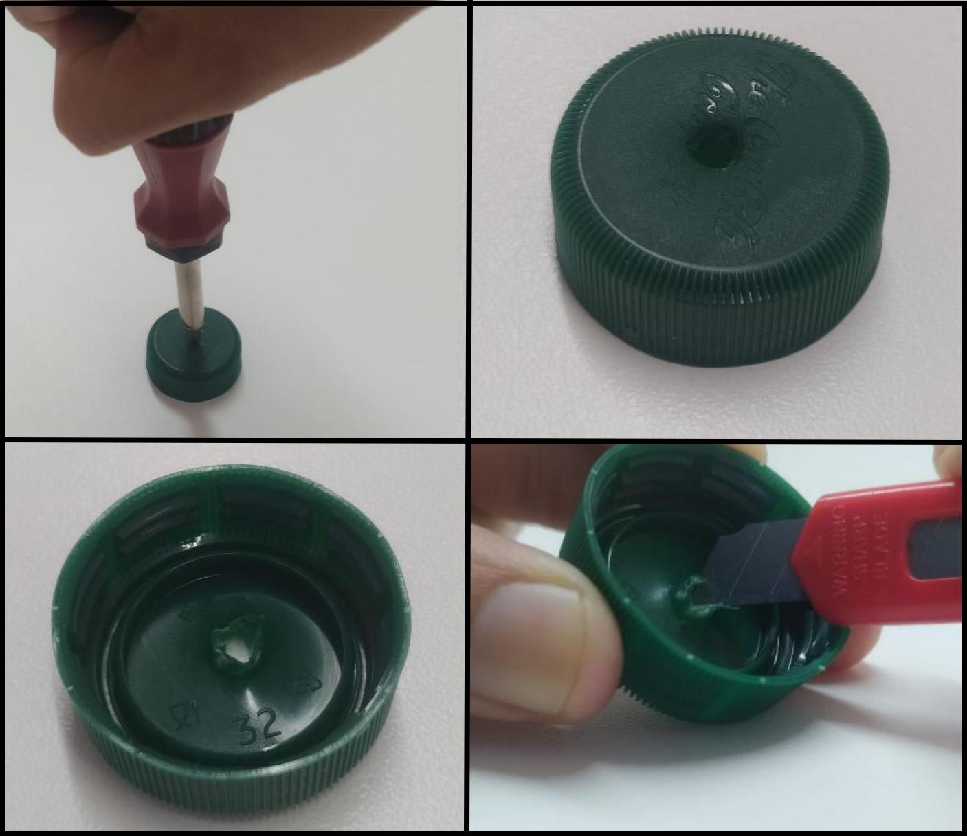 Haremos un orificio en la tapa, que servirá para ingresar válvula, con algún elemento punzante (en la imagen se ve como usamos un destornillador). Luego sacamos la rebaba que queda con una cuchilla y, si el orificio sigue siendo menor que el diámetro de la válvula, lo agrandamos con la misma cuchilla hasta que tenga el tamaño suficiente. Incluso es mejor que sea un poco menor que el diámetro de la válvula, para que entre a presión y no le dejemos todo el trabajo a la tuerca de la válvula.