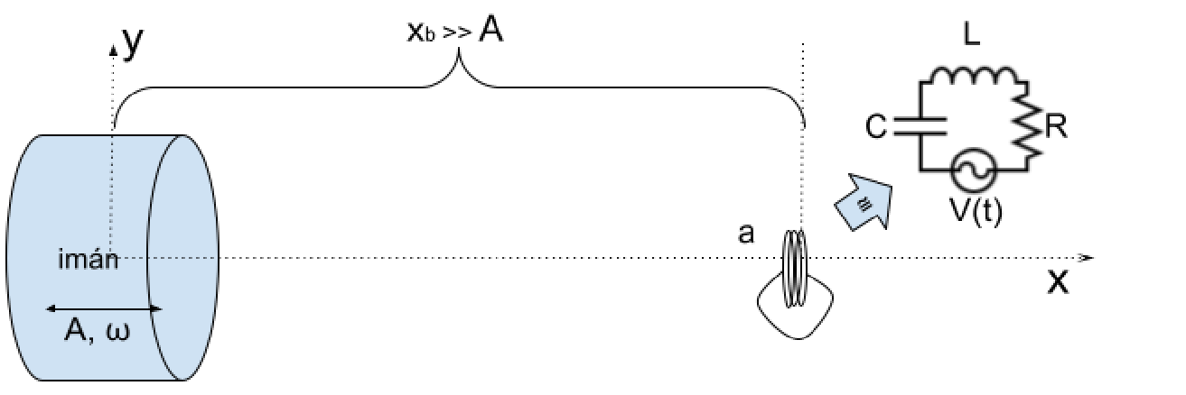 Como se indica en la figura, a una distancia $ x_b \gg A$ del origen y sobre el eje $ \hat{x}$, se coloca una bobina de área $a$ y $n$ vueltas muy juntas con normal paralela al eje $\hat{x}$, y cuyos extremos están unidos. El campo magnético sobre la pequeña bobina puede considerarse uniforme y perpendicular al plano de las espiras. Se supone que la bobina real puede modelarse como un circuito ideal $RLC$ en serie, y que el voltaje $V(t)$ inducido en la bobina por el campo magnético del imán es equivalente a una fuente de tensión alterna de voltaje $V(t)$ en el circuito.